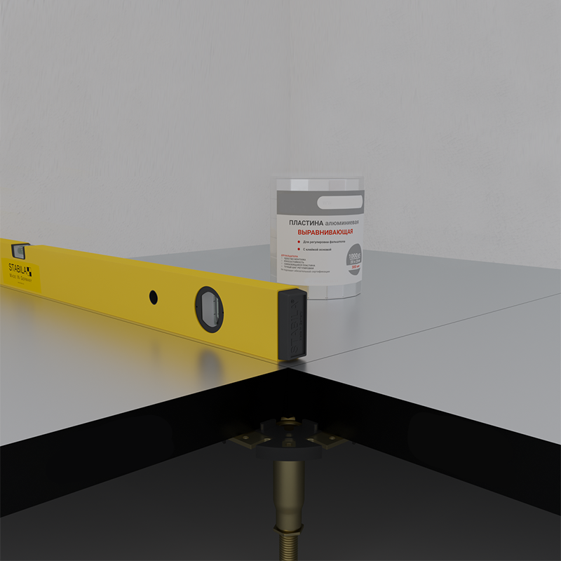 Инструкция по монтажу фальшпола. Как установить фальшпол? Монтаж фальшпола в Узбекистане. Шаг 12 — Выравнивание погрешностей После укладки панелей проверьте общую высоту фальшпола с помощью уровня. Для точечного выравнивания уровня панелей используйте самоклеящиеся алюминиевые регулировочные пластины толщиной 0,2 мм. Они наклеиваются на нужную секцию гаскета, под углом каждой панели, где требуется коррекция высоты.