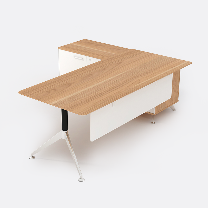 Стол менеджера DP81 с боковой тумбой, встроенным кабель-менеджментом и хромированной ножкой. Комфортное и стильное решение для современного офиса.