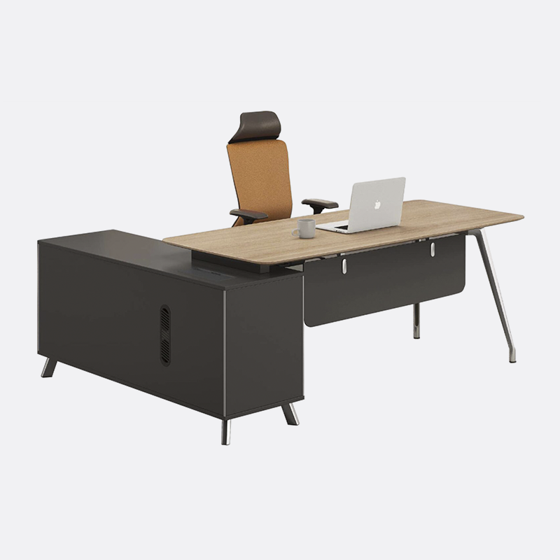 Менеджерский стол DV88 с боковой тумбой, люком для проводов и хромированной опорой. Идеальный выбор для стильного и упорядоченного офисного пространства.